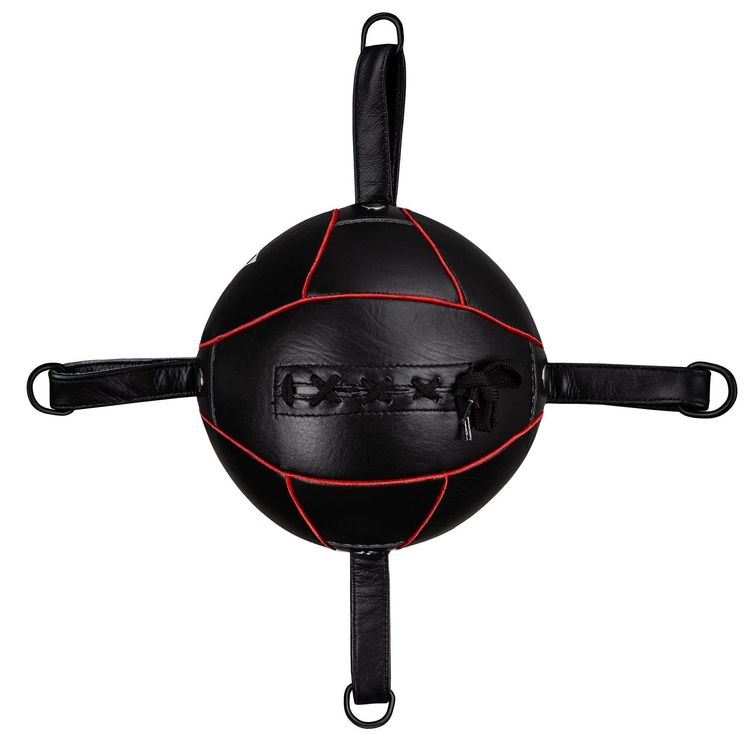 The Spider Bag brilliantly combines all of the benefits of light bag, double end bag and defense training in one extremely versatile piece of equipment. Simply attach the four heavy-duty resistance stretch bands to the corner posts of any boxing ring or existing four poles in the gym or training area, and instantly create an ideal way to perfect punching and working off angles, slipping, ducking, bobbing, weaving, head movement and nearly every aspect of your offensive and defensive game. The line of the resistance bands enhances your footwork, both side-to-side and forward-back. Combined with the action of the air-filled center target ball, it forces you to think – and react – both offensively and defensively, honing and improving all your boxing skills to be an all-around better fighter. Genuine leather target ball is triple nylon stitched with leather welted seams for professional results. Comes complete with heavy-duty chrome O-ring attachments on each side and durable resistance bands.